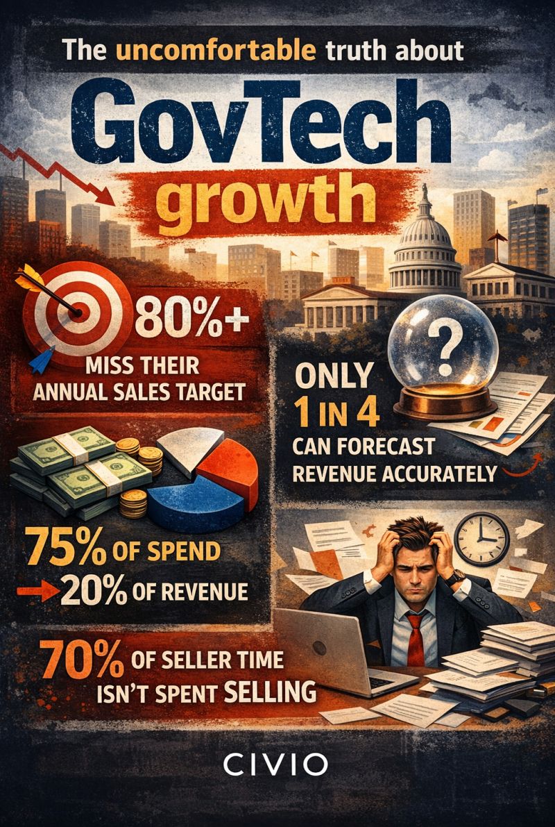 Last year, over 80% of GovTech companies missed top-line sales targets, and only about 27% can forecast within plus or minus 10% accuracy. Roughly 75% of sales and marketing spend produces only 20% of revenue.