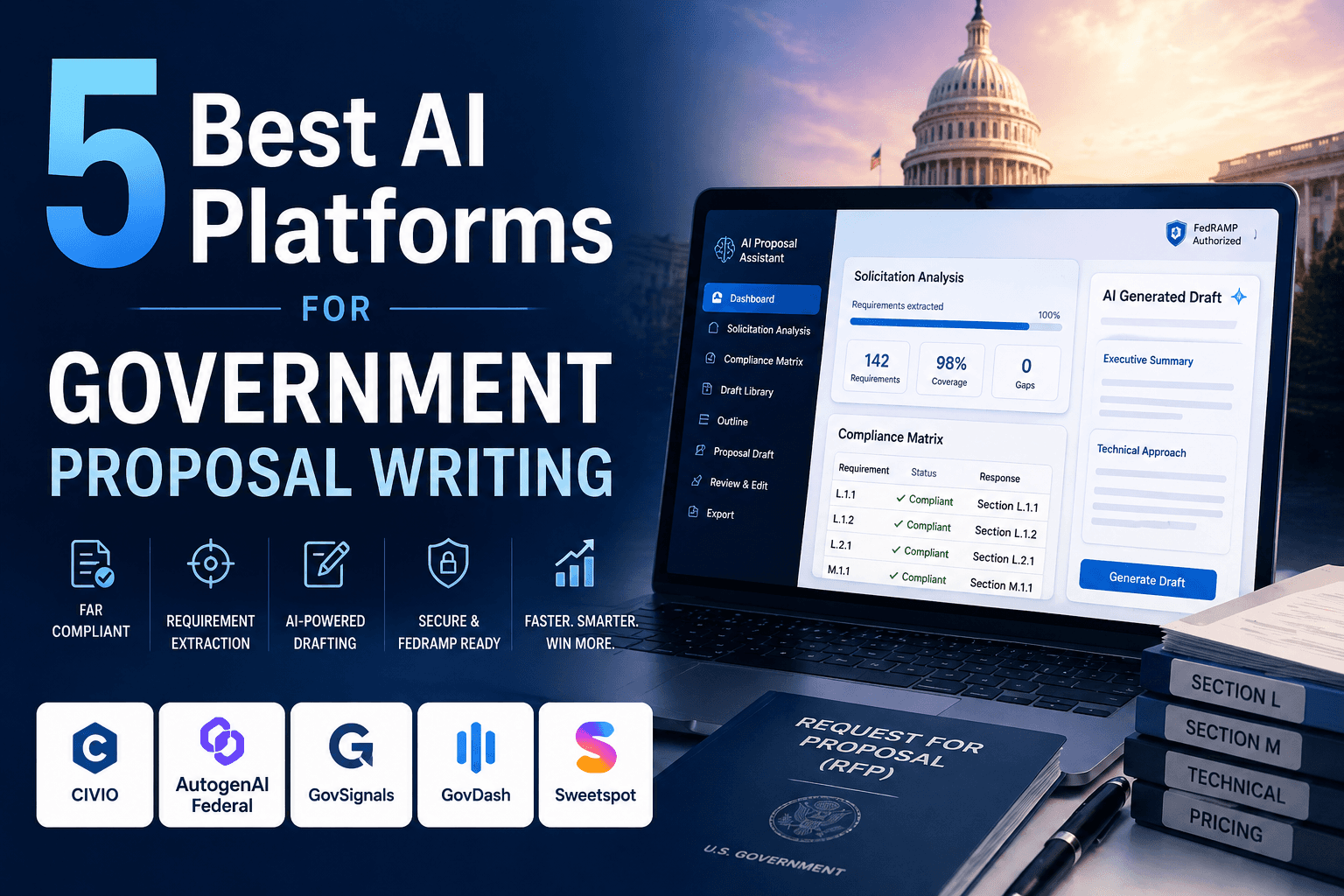 This guide ranks the five best AI platforms for government proposal writing in 2026. The evaluation considers writing quality, FAR compliance, requirement extraction accuracy, content approach, security posture, and lifecycle integration.